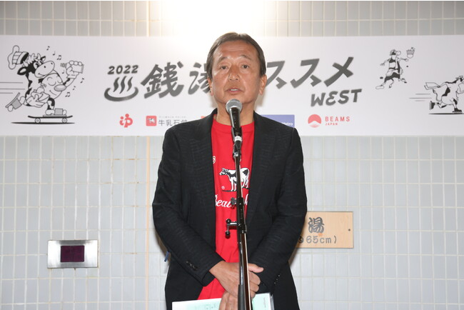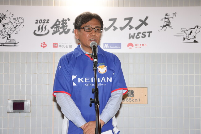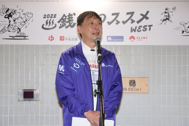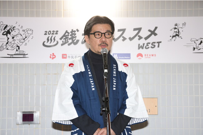 関西初上陸となる今回は、これまで「銭湯のススメ。」に取り組んできたBEAMS JAPANと牛乳石鹸に、Osaka Metro、京阪電車、大阪府公衆浴場業生活衛生同業組合が加わった5団体の共催で「銭湯のススメWEST」を開催します。記者発表会では、各団体の代表者がプロジェクトへの想いを語りました。