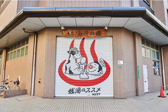 記者発表会の会場となった「湯処あべの橋」でも、暖簾ジャック第一号として男湯の入り口にオリジナル暖簾が登場したほか、シャッターにもCOOK氏のアートワークが掲出されました。