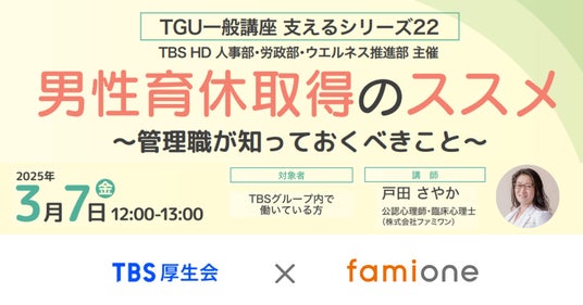 「子どもを願うすべての人によりそい 幸せな人生を歩める社会をつくる」をビジョンに掲げ、法人の従業員向け福利厚生や自治体の住民向け支援を行うヘルスケアサポートサービス「ファミワン」 https://famione.com/benefit/ などを展開する株式会社ファミワン(本社:東京都渋谷区、代表取締役:石川勇介)は、TBSグループの従業員で構成されたTBS厚生会(本社:東京都港区、理事長:上田学、以下「TBS厚生会」)へ提供の一環として、TBSグループ内で働いている方を対象にしたオンラインセミナー「男性育休取得のススメ~管理職が知っておくべきこと~」を3月7日に開催しました。