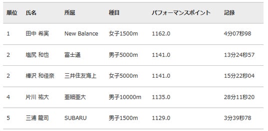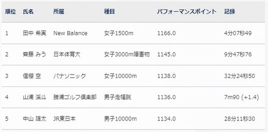 ※「パフォーマンスポイント」は、「記録ポイント」(Scoring Tablesをもとに記録をポイント化したもの)と、「順位ポイント」、「特別ポイント」(日本記録、日本タイ記録、ワールドスタンダード記録を突破した際に付与するもの)を合計したポイントのことを言います。