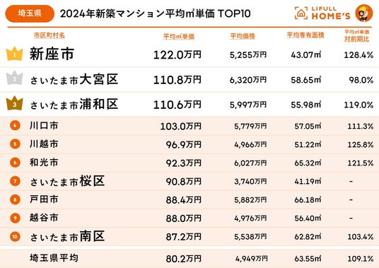 LIFULL HOME'S新築マンション価格2024埼玉県TOP10