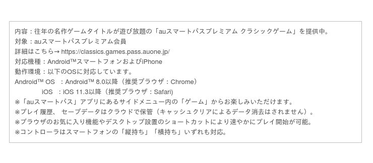 内容:往年の名作ゲームが遊び放題の「auスマートパスプレミアム クラシックゲーム」に、新たなタイトルが追加されます。