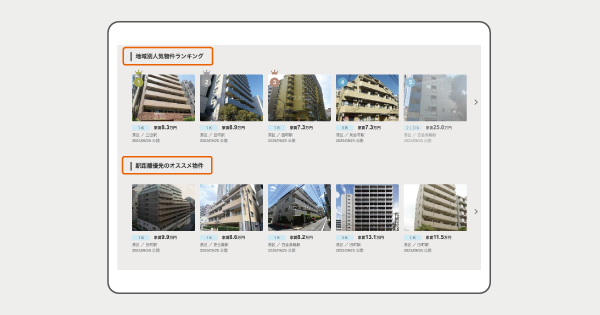 トップページにて「全国人気物件ランキング」「新着人気物件ランキング」、検索結果一覧ページにて「地域別人気物件ランキング」「駅距離優先のオススメ物件」などが表示されるようになりました。ユーザーにさまざまな視点からの比較検討を促し、サイト回遊率のアップをサポートします。