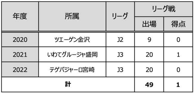 J2リーグ 9試合(0得点) / J3リーグ 40試合(1得点)