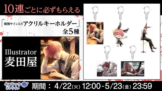 10連ごとに必ずもらえる!1度の決済にて10回まとめて引いていただいた方には、「複製サイン入りアクリルキーホルダー(5種ランダム)」を必ず1個プレゼント!対象販売プラン「10回ひく」購入者が対象です。