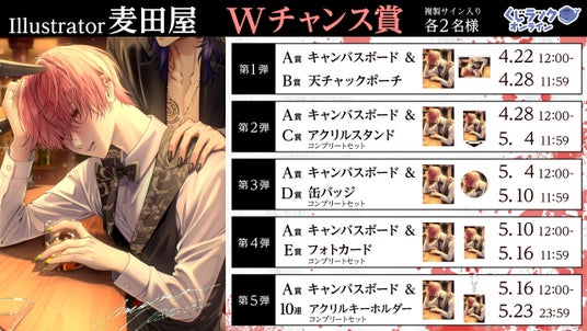 カルチュア・エンタテインメント株式会社は、イラストレーター『麦田屋』とのコラボを実施いたします。2025年4月22日(火)より『麦田屋』のオンラインくじを、「くじラックオンライン」で販売いたします。さらに、くじ1枚ご購入ごとにWチャンス賞の抽選が行われ、当選した方は特別な賞品が獲得できます。