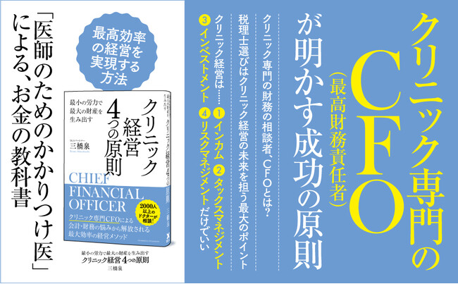 ビジネス書や実用書を中心に出版する株式会社クロスメディア・パブリッシング(本社:東京都渋谷区、代表取締役社長:小早川幸一郎)は、2024年2月2日に書籍『最小の労力で最大の財産を生み出す クリニック経営4つの原則』を刊行します。本書はのべ2000人のドクターから財務の相談を受けた、「クリニック専門のCFO(最高財務責任者)」である三橋泉氏による、クリニック経営を最高効率で成功へ導く方法を解説した本です。