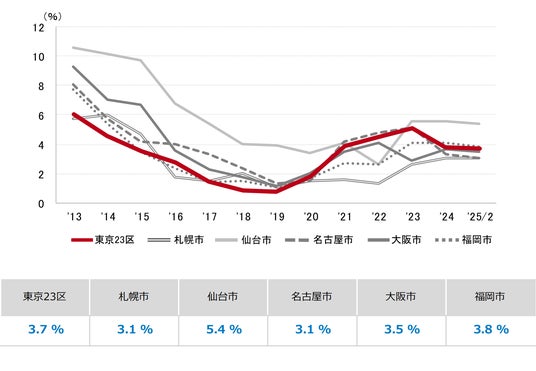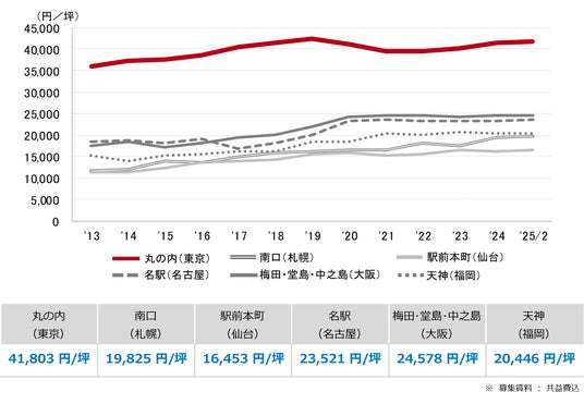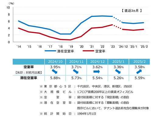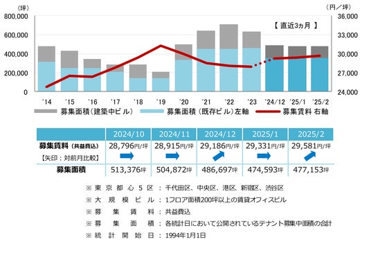 三幸エステート株式会社(本社:東京都中央区、取締役社長:武井重夫)は、2025年2月度の東京都心5区(千代田区、中央区、港区、新宿区、渋谷区)および全国6大都市(東京、札幌、仙台、名古屋、大阪、福岡)の大規模ビル※1のマーケットデータをまとめた「オフィスマーケット2025年3月号」を公表します。
