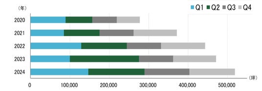 成約面積はリーシング活動の活発度を表す指標である。2024年の年間の成約面積は約52万坪となり、2023年の約47万坪を上回った。また、50万坪を超えるのは2014年以来となる。成約面積は4年連続で対前年比プラスを記録し、リーシング活動は拡大傾向が続いている。