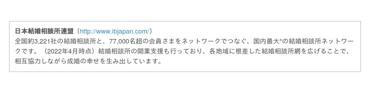 事業内容:婚活事業(結婚相談所連盟、直営結婚相談所、婚活パーティー、婚活サイト、合コン)