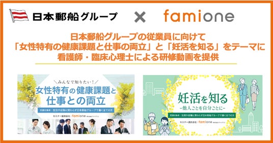 「子どもを願うすべての人によりそい 幸せな人生を歩める社会をつくる」をビジョンに掲げ、法人の従業員向け福利厚生や自治体の住民向け支援を行うヘルスケアサポートサービス「ファミワン」 https://famione.com/benefit/などを展開する株式会社ファミワン(本社:東京都渋谷区、代表取締役:石川勇介)は、日本郵船株式会社(本店:東京都千代田区、代表取締役社長:曽我 貴也)とそのグループ会社の従業員向けに、「女性特有の健康課題と仕事の両立」等をテーマに専門家による研修動画2本の提供を開始しました。