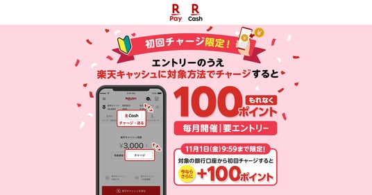 さらに、11月1日(金)までに対象となる全国の金融機関口座(注3)から1,000円以上チャージした方に、もれなく「楽天ポイント」100ポイントが進呈されるため、最大200円分の「楽天ポイント」が進呈されます。
