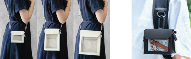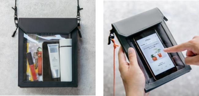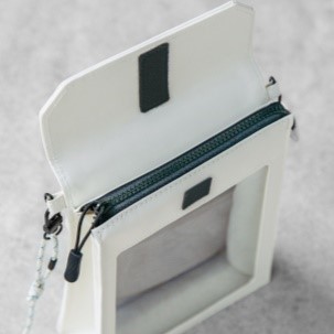 透明ポケットで中身が一目でわかり、スマートフォンを中に入れたまま画面操作をしたり、お気に入りのグッズを見せながら収納できます。