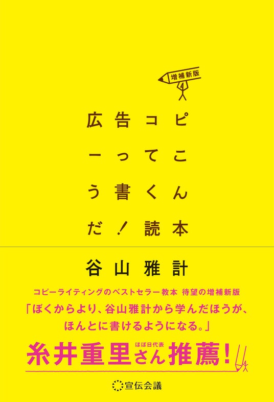 『広告コピーってこう書くんだ!読本〈増補新版〉』谷山雅計著/定価2,200円(税込)2007年に発売された広告コピーのロングセラー書籍『広告コピーってこう書くんだ!読本』が、増補新版になって新登場。デジタルやSNS時代のコピーのあり方についても言及した、約2万5000字の新テキストを収録しました。「人に伝わる」「伝える」広告コピーを書くためのプロのエッセンスを学べる一冊。