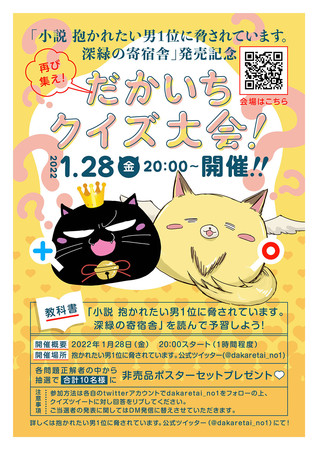 出題範囲は 『小説だかいち2』 会場は、だかいち公式twitter(@dakaretai_no1) プレゼントは、非売品ポスター(抽選) 、クイズ大会の開催です!!!