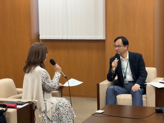 収録後の平松社長(右)とパーソナリティの佐野瑛厘