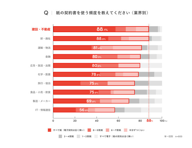 ・76%の人が頻繁に紙の契約書を活用し、2024年問題が指摘されている建設・不動産業界では88%で特に多い
