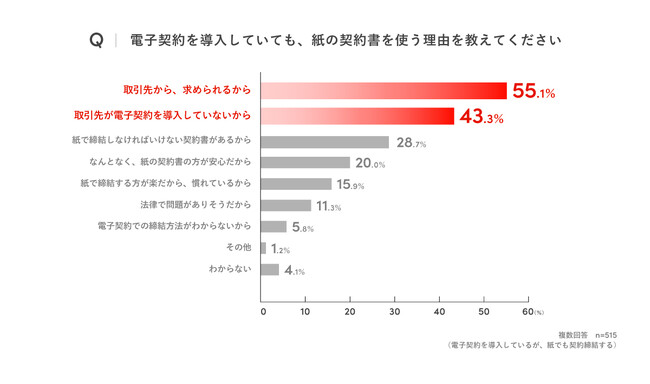 電子契約を導入していながら、紙で契約締結を行う理由について聞いたところ「取引先から、求められるから」が55.1%と最も多く、次いで43.3%が「取引先が電子契約を導入していないから」と回答しました。外的環境の要因によって、電子契約の利用が進まない実態が明らかになりました。