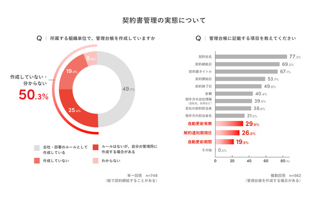 さらに、所属する組織単位で契約書を管理するために台帳を作成しているか聞いたところ、50.3%が「作成していない・わからない」と回答しました。台帳作成をする場合の項目については、「自動更新の有無」を記載しているのは29.9%、「解約通知期限日」は26.0%、「自動更新期間」は19.9%に留まっており、多くの場合で期限管理に重要な項目は記載されていないことが明らかになりました。また、既存の契約状況を確認するために契約書を探すだけで一人あたり10時間費やしている実態が明らかになりました。