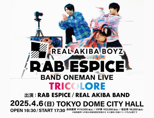 アニソンダンスパフォーマー「REAL AKIBA BOYZ」 (METEORA st.所属)の新世代メンバー3名、「ネス」「とぅーし」「ゾマやかじゃない!」にて構成された「RAB ESPICE」が、TOKYO DOME CITY HALL公演 “RAB ESPICE BAND ONEMAN LIVE「TRICOLORE」 “の開催を発表。合わせて「RAB ESPICE」への新メンバーの加盟が発表された。