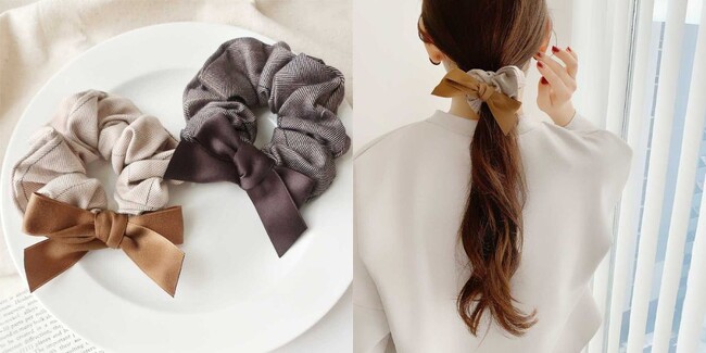 クラシカルで上品なイメージのリボン付きチェック柄シュシュ。