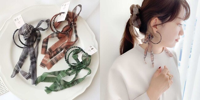 透け感があるので、同じチェック柄のヘアアクセサリーと組み合わせても、重くならずにコーディネートを組むことができます◎