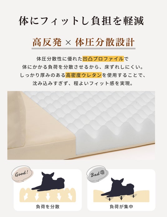 中材にはへたりにくく弾力性に優れた高反発クッションを採用。ペットの体をしっかり支え、負担を軽減するため、長時間の使用でも快適な寝心地が続きます。沈み込みすぎず、立ち上がりやすい反発力があるため、シニアや関節が気になるペットの飼い主さまからも注目を集めています。