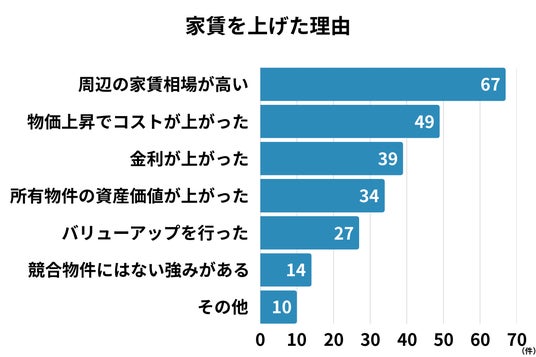 ・家賃を上げた理由は「周辺の家賃相場が高い」が最多、次点で「物価上昇でコストが上がった」