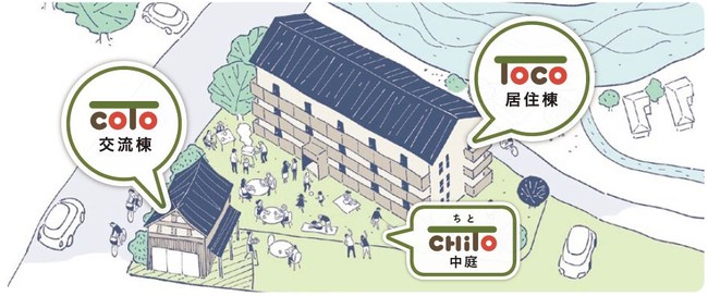 敷地内には、居住棟の「TOCO(とこ)」、交流棟の「COTO(こと)」を建設、さらにイベントや家庭菜園などに使える空間として「CHiTO(ちと)」と名付けた中庭を整備します。交流棟・COTOには、地元企業や移住者が利用できるシェアオフィスやコワーキングスペースを用意し、入居者・地元住民が交流しながら働き、ともに地域をつくっていくための拠点となります。