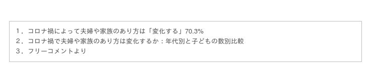 ・家族との時間が増えることはいい事だけどコロナ禍で出掛けられない気晴らしが出来ないからギクシャクしちゃったり逆にコロナ禍で家族愛が増したケースもあるから良くも悪くも変化すると思う(20代:パート/アルバイト)