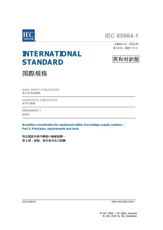 IEC 60664-1 Amd.1 Ed. 3.0:2025 (b) 追補1-低圧電源系統内機器の絶縁協調-第1部:原則,要求事項及び試験 Amendment 1 - Insulation coordination for equipment within low-voltage supply systems - Part 1: Principles, requirements and tests 本規格は、低圧電源系統に接続される機器の絶縁設計において、空間距離・沿面距離・固体絶縁の要求事項や試験方法を定めた基本安全規格(第3版)に対する追補1(Amendment)です。