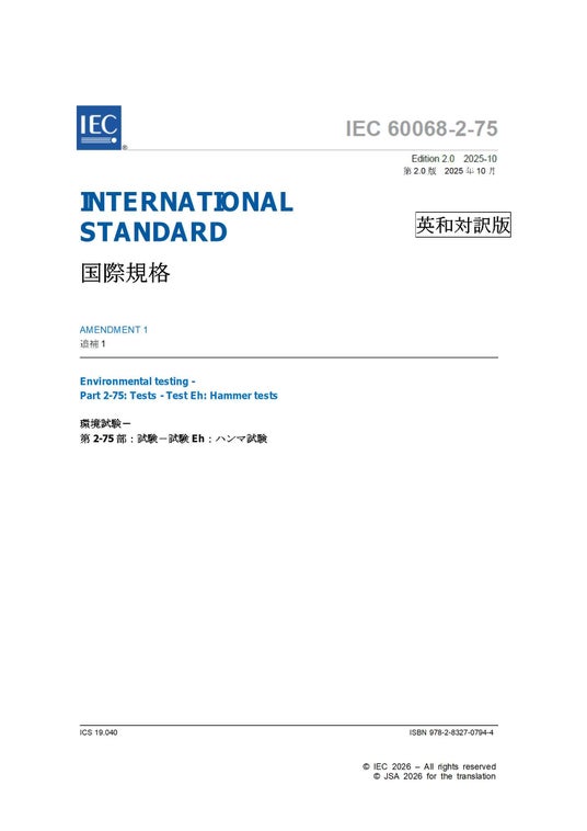 IEC 60068-2-75 Amd.1 Ed. 2.0:2025 (b) 追補1-環境試験-第2-75部:試験-試験Eh:ハンマ試験 Amendment 1 - Environmental testing - Part 2-75: Tests - Test Eh: Hammer tests 本規格は、電気・電子機器の堅牢性を評価するための「試験Eh:ハンマー試験(振り子、スプリング、垂直)」に関し、試験装置の仕様や手順を規定した国際規格に対する追補1(Amendment )です。