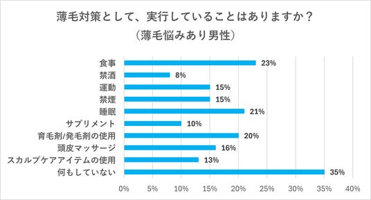 続いて、実際の薄毛対策について調査をしたところ、「薄毛対策として実行していることはありますか」という設問に対して、薄毛悩みを抱えている約3人に1人は「何もしていない」と回答しました。また、薄毛悩みを抱えている男性は「食事」や「睡眠」の改善には取り組めているものの、「スカルプケアアイテムの使用」や「頭皮マッサージ」などの頭皮ケアについては実践できていないということも分かりました。