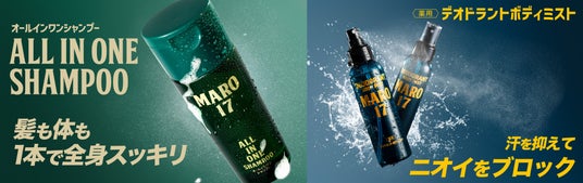 株式会社ネイチャーラボ(本社:東京都渋谷区)が展開するメンズケアブランド『MARO17(マーロセブンティーン)』は、汗をおさえてニオイをブロックできる「MARO17 薬用デオドラントボディミスト」を2025年4月1日(火)より発売いたします。また、1本で全身洗える「MARO17 オールインワンシャンプー」も同日発売いたします。