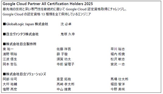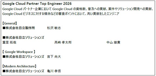 株式会社日立製作所(以下、日立)は、グーグル・クラウド・ジャパン合同会社が主催する「Google Cloud Partner Top Engineer 2026」ならびに「Google Cloud Partner All Certification Holders 2025」において、日立グループ全体で延べ29名のエンジニアが受賞したことをお知らせします。日立が長年培ってきたITとOTの知見に加え、Google Cloud の活用を通じて蓄積した実践的なスキルに基づき、クラウド人財育成に取り組んできた成果が実を結び、今回の受賞につながりました。