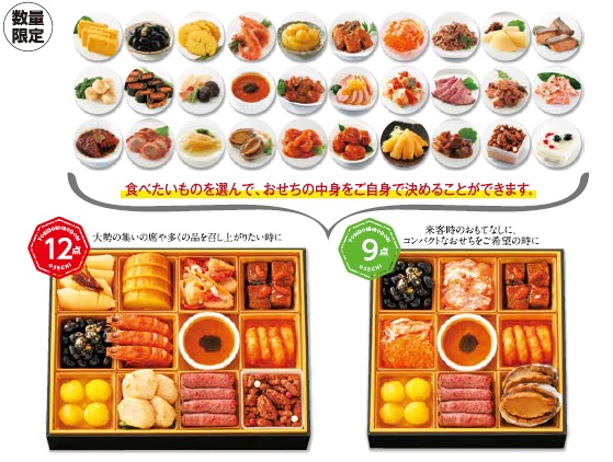 お好きな物、食べたいものを自由に12品(12マス)、または9品(9マス)を選び、1マスことに中身をご自身で決めることができるおせち料理です。冷凍便でお届けいたします。