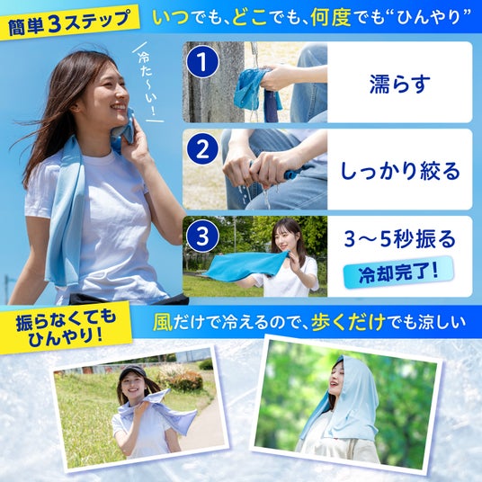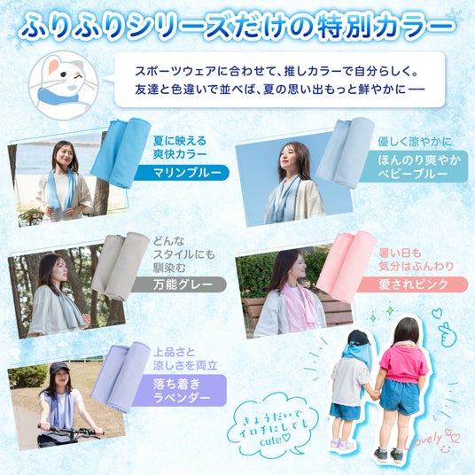 昨年、在庫切れが続出するほどの大ヒットを記録した『ふりふり冷感タオル君』。UVカット・瞬間冷却・高耐久の機能はそのままに、新カラーを加えてリニューアル。企業向け大量購入も対応で熱中症対策にも最適です。
