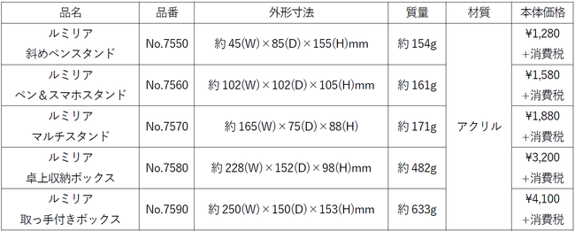 今回は、コスメや文具など幅広いアイテムを収納できる5製品をラインアップ。「斜めペンスタンド」はペンなどを斜めに収納でき、探しやすく取り出しやすい設計です。「ペン&スマホスタンド」はペンをはじめ文具や小物を収納でき、手前にスマホを立てかけておくこともできます。「マルチスタンド」はミラーやコーム、メイクパレットなどスリムな小物を立てかけるのに便利です。「卓上収納ボックス」はメイクブラシのような長さのあるものからアクセサリーなどの小物まで、幅広いアイテムをまとめてに収納できます。「取っ手付きボックス」は取っ手があるため、移動させて使用するアイテムの収納に便利です。