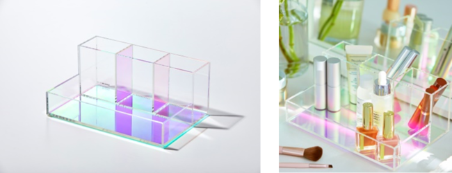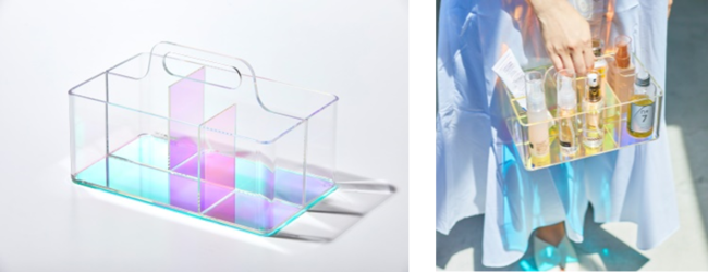 「ルミリア」アクリル収納シリーズは、光のあたり方や見る角度によって色が変わるオーロラカラーをアクセントにした、汎用性の高い収納用品です。素材は透明度の高いアクリルを使用し、ポイントとしてオーロラカラーを配色することで、上品なデザインに仕上げました。