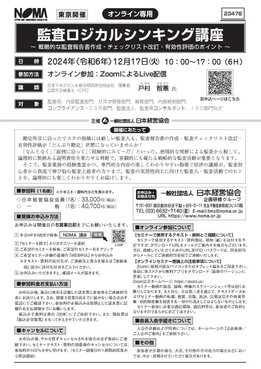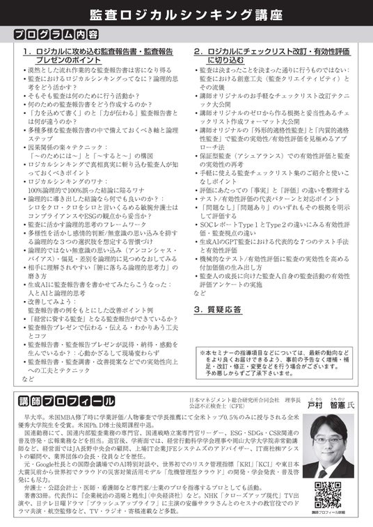 ・セミナー名称: 「監査ロジカルシンキング講座: 戦略的な監査報告書作成・チェックリスト改訂・有効性評価のポイント」