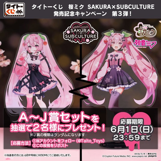 「タイトーくじ 桜ミク SAKURA×SUBCULTURE」の発売を記念して、「A賞~J賞セット」を抽選で2名様にプレゼントするキャンペーンを実施いたします。