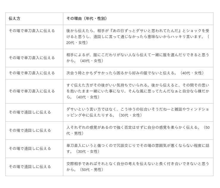 「伝える」と回答した理由は、直接伝えて一緒に服を選ぶことができるからや、長い付き合いを考えたときにダサいままでは嫌だからなどがありました。