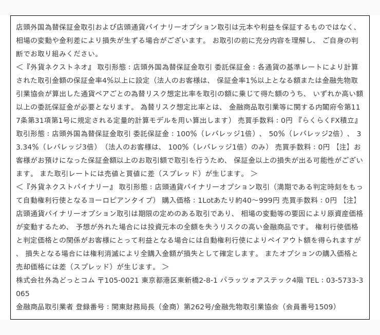 ※A 本広告は『外貨ネクストネオ』における1,000Lot以下のスプレッドを表示するものです。国内外の休日や平日早朝など市場の流動性が低い時間帯、主要経済指標の発表前後、ならびに天災地変または金融・経済関連の重大事件など予期せぬ突発的事象の発生時には、一時的にスプレッドを広告表示値よりも拡大する場合があります。当社のスプレッド表記は、提示率(全取引時間中に占める広告表示値以下のスプレッド提示時間の割合)を基に算出しております。本広告では、1pip=0.0001(米ドル、スイスフラン、豪ドル、英ポンド、カナダドル、NZドル)、1pip=0.001(トルコリラ)として表現しております。提示スプレッドにつきましては、当社の都合により予告なく変更または中止する場合があります。なお、大口スプレッドおよびダイレクトカバーは本広告の対象外です(詳細はhttps://www.gaitame.com/service/fx/rules/execution/ )。