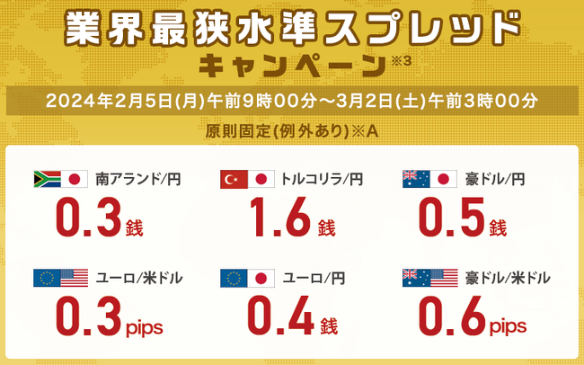 ※3 「業界最狭水準スプレッドキャンペーン」スプレッド(対象期間:2024年2月5日(月)午前9時00分~2024年3月2日(土)午前3時00分 、提示時間帯:対象期間中の各営業日午前9時~翌午前3時)
