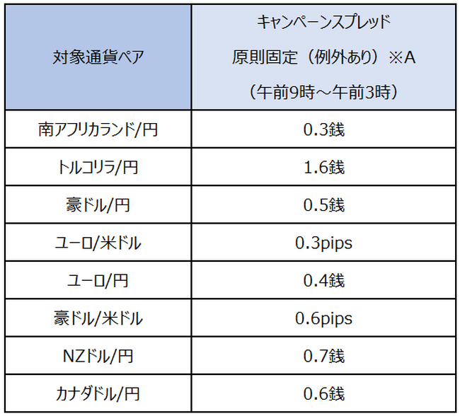 ※キャンペーンスプレッドの提示時間帯はすべて対象期間中の各営業日の午前9時~翌午前3時。同期間中の通常スプレッドは各営業日の午前3時~午前9時に提示。