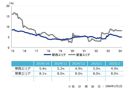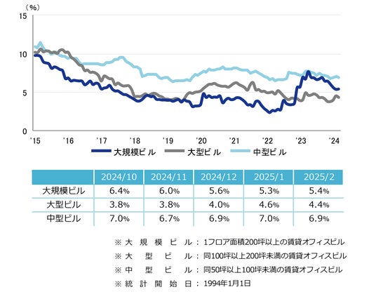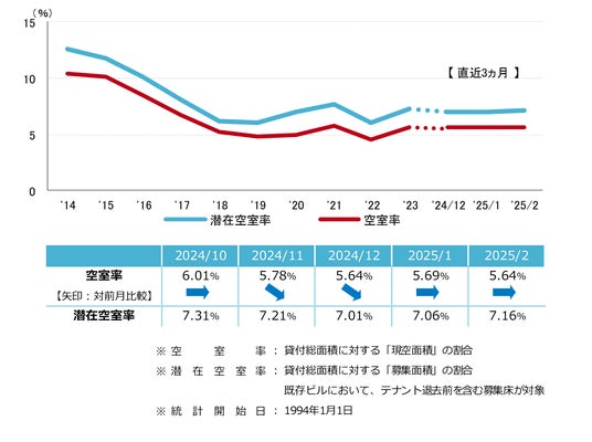 空室率は前月比マイナス0.05ポイントの5.64%となり、前月から小幅に低下した。主要エリア内での移転や集約により空室が生じた一方、新規開設等により空室消化が進んだ。潜在空室率は前月比プラス0.10ポイントの7.16%だった。