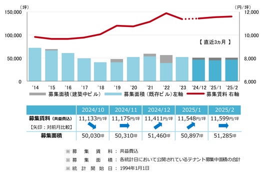 オフィス需要は前向きな移転を中心に堅調な一方、募集床の品薄感が強まっており、大口の面積帯は限定的な状況が続いている。