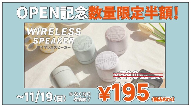 オープンから10日間は、累計販売数14万個以上を売り上げている人気の「ワイヤレススピーカー」を数量限定半額の税抜195円(税込215円)で販売いたします。