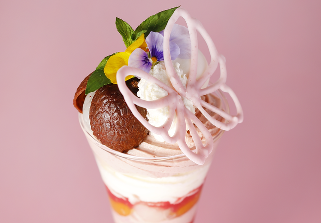ライチシャーベットとジャスミンのオリエンタルな香りとデコレーションも鮮やかな初夏を感じさせる自由が丘店オリジナルパフェです。