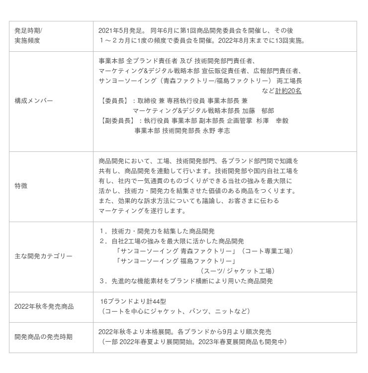 三陽商会は、市場に支持される価値のある商品をつくりお客さまに訴求すること目的に、2021年5月、全社横断のプロジェクトとして「商品開発委員会」を発足。コートを中心にジャケットやパンツなど開発した商品全44型を、今年9月から11月にかけて各ブランドより本格展開いたします。